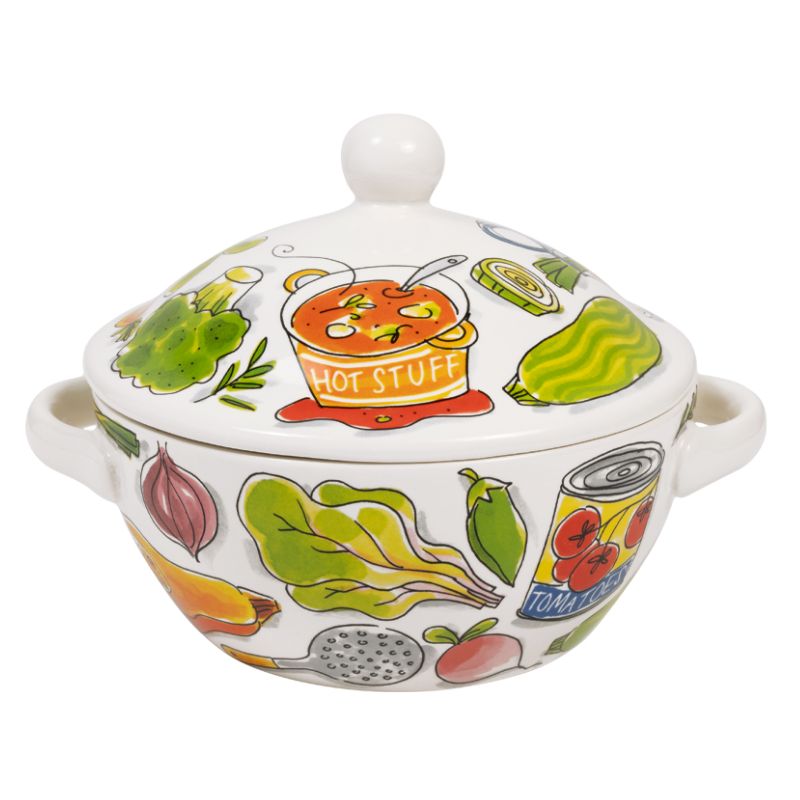Hot stuff coming through! Of je nu een dampende pan tomatensoep op tafel zet of een kruidige pompoenvariant: in deze keramieken soepterrine blijft het niet alleen warm, maar ook gezellig. De vrolijke illustraties van verse groente en blikken tomaten maken dit stuk tot de ster van je soepmoment. Met zโn royale formaat van 23 cm is er genoeg om uit te delen