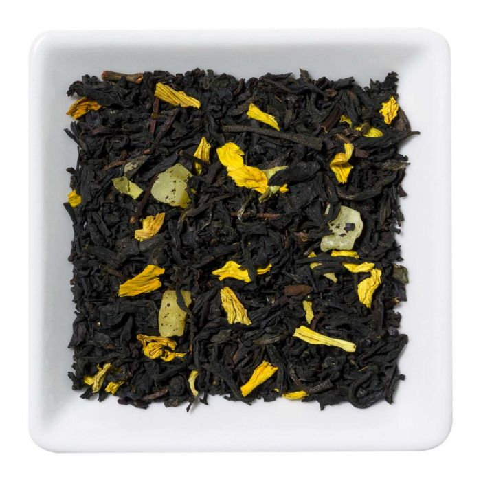 Een geurige zwarte thee met de rijpe exotische smaak van mango. Zwart thee, mango, zonnebloemblaadjes en aroma.