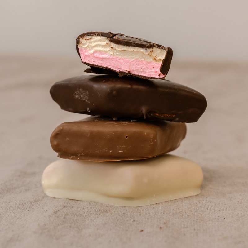 Roze gele ruitspek in een lekkere, knapperige laag verse chocolade (met de hand) gedipt. Een product uit ons Eigen Atelier.